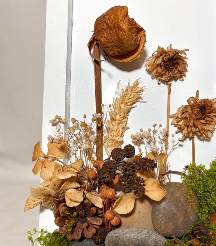En su elaboración se utilizan flores secas reales, musgo, piñas pequeñas y piedras de río suavizadas. Estos materiales aportan una estética auténtica y tonos tierra que combinan fácilmente con distintos estilos de decoración. - Diseño Vertical con Relieve:
